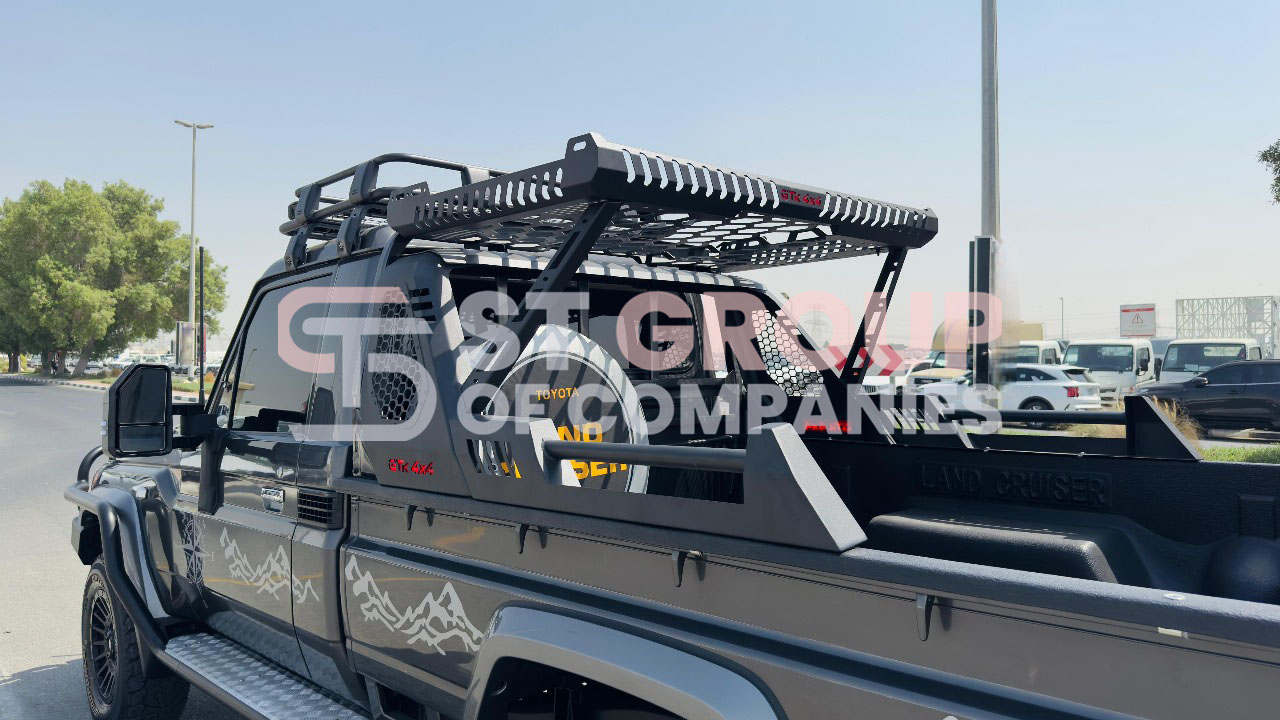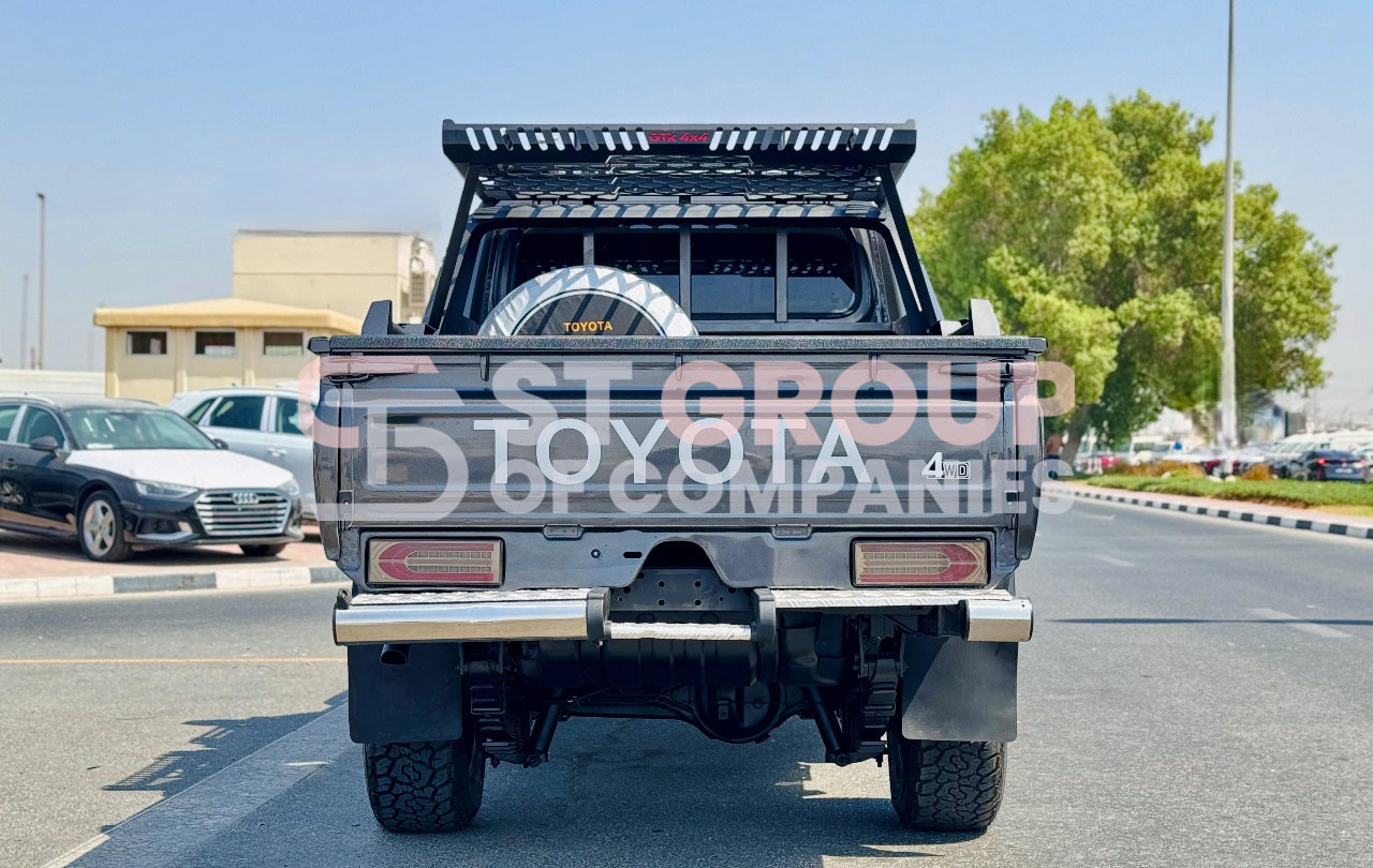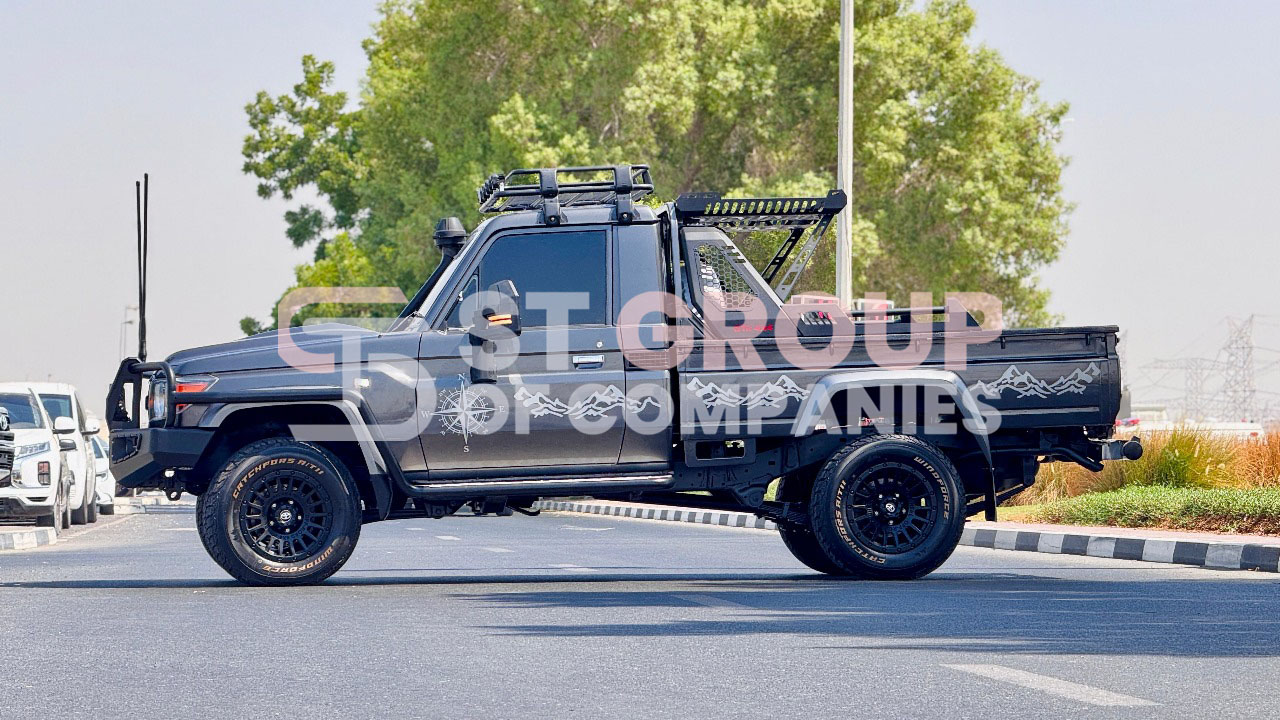 With only 18,036 km mileage, this grey Land Cruiser Pickup comes fully equipped with premium upgrades including heavy-duty bull bar with LED lights, roof rack, air snorkel, alloy wheels, premium leather seats, cruise control, traction control, lane assist, multimedia screen, and tinted windows. Designed for both adventure and utility, the single cabin offers robust payload capacity while keeping the driver and passenger in absolute comfort.